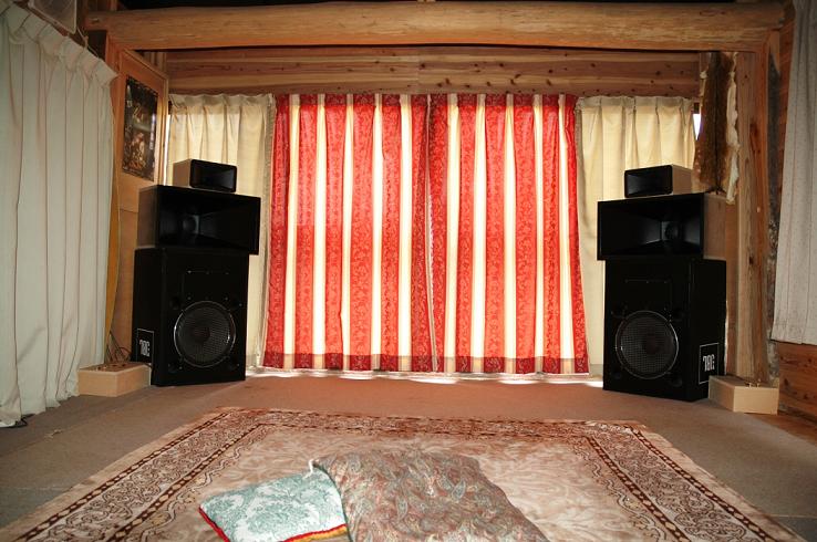 Towards this aim, ideally you want to set the cornerhorns on walls that are straight and lacking features that would cause reflections, things like rafters or small shelves, etc. You're using the expansion of the corner from the apex as a large horn, so the same things you'd want in a horn are what you want in the walls. There is one exception, the walls don't need to be rigid, and really shouldn't be. We have competing priorities here - Normally, you want horn walls to be rigid, but in this case, we want the room walls to provide some damping. The perfect walls would be rigid down to the Schroeder frequency (around 100Hz to 150Hz) and then would be flexible below that, absorbing some of the bass energy and damping room modes.