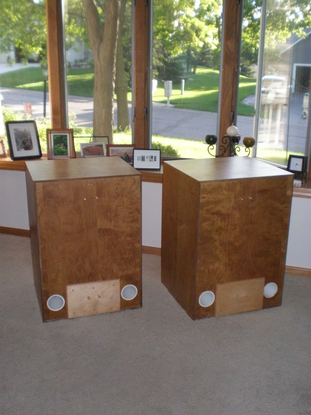 Those speakers look fantastic! Three cubic feet tuned to 38Hz, yes, those are the same as four π's. I like the two-tone look very much, and in fact, my surrounds are done just like that - two π's with the exact same finish, darker sides and lighter front. I just think it looks great. Congrats!