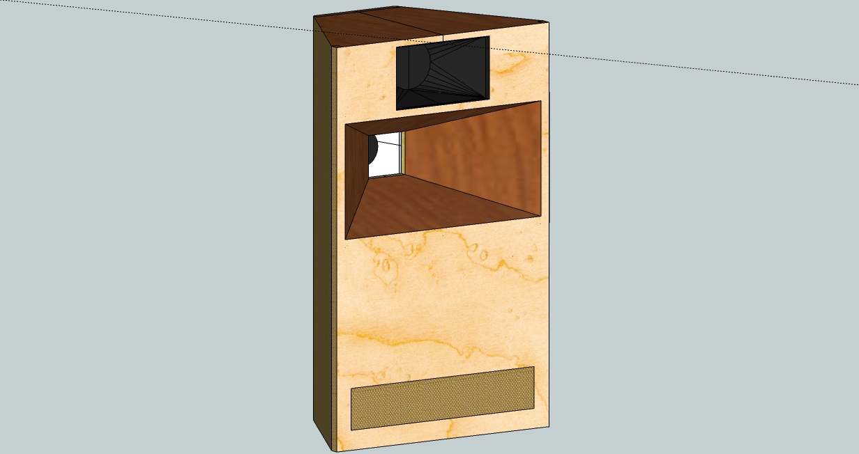 I have been playing with the 8 pi design in Google Sketchup (a great excuse to learn it finally) and would like you to consider the attached model. My first priority would be integrating the tweeter horn as a part of the main enclosure rather than a separate box. A couple ways come to mind, a partition inside so the original enclosure volume for the woofer is not changed and secondly, actually utilizing the extra volume around the tweeter. Is there any advantage to a larger box?