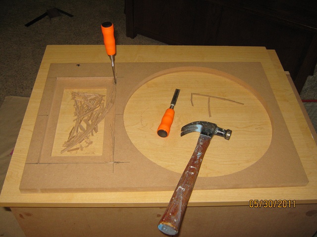 Unfortunately, the pre-cut openings for the horn were incorrect (they were to small). After much internal debate about getting out the router and developing some sort of jig I decided to remove the extra material with a chisel.