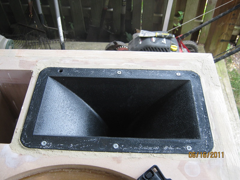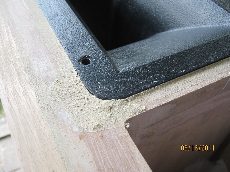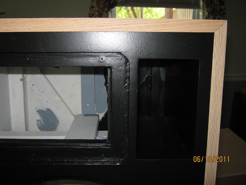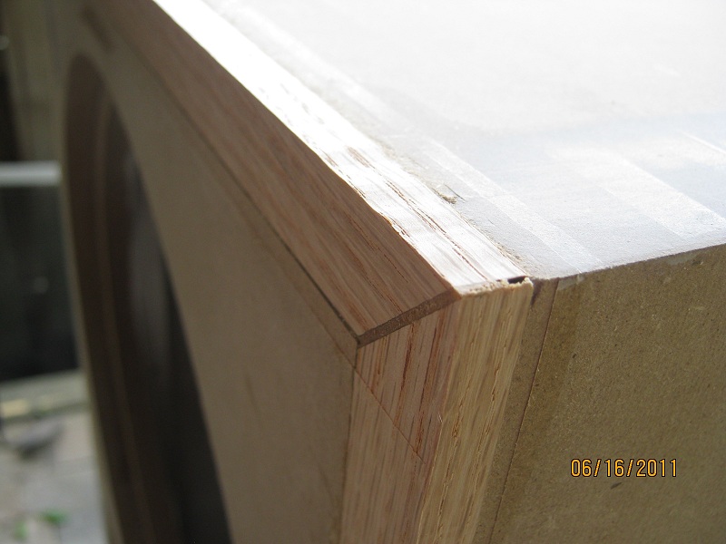 After flush trimming the oak the speakers looked MUCH better, I was a little concerned about the process but it worked great. A little woodfiller and a lot of sanding followed.
