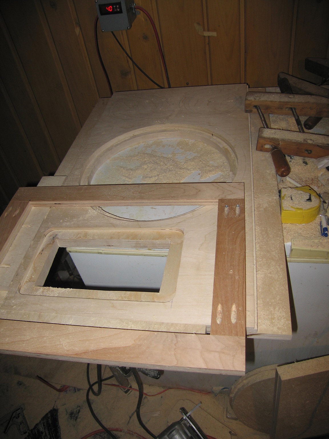 I decided to use spliced leaves of veneer and made a what was probably a bad choice of contact cement to apply the veneer. Following the glue directions closer might have helped, but I had done some veneer work years ago and had decent results. I thought that I knew what I was doing. That wasn't the case. I started on the backs of the speakers, but the results were so bad that I stripped the veneer off and decided to start over. To replace the veneer, I purchased 2-ply veneer and it worked well. There was a lot more stiffness, structure, and durability than the veneer leaves that I was using. Looking back, changing the brand of contact cement may have worked with 2-ply veneer, but I decided to make a veneer press. Some of the veneer press images are shown below: