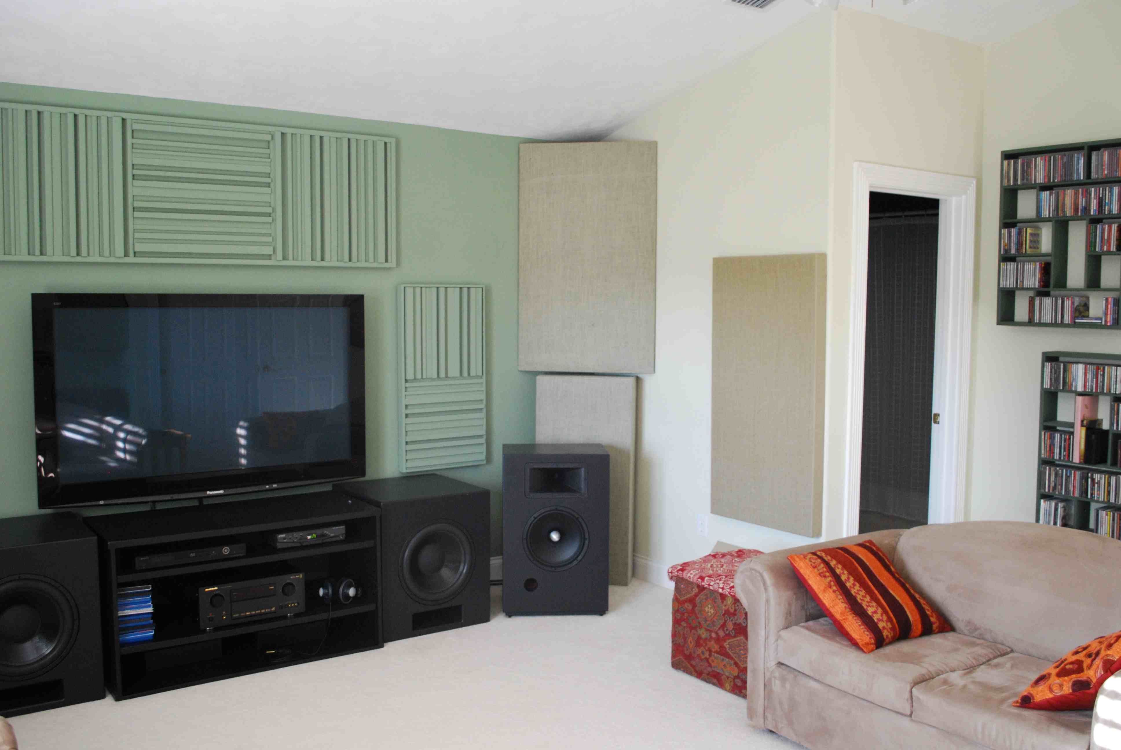 I see you have flanking subs in that photo - which is the best thing to do with your three π speakers. Constant directivity cornerhorns are a little different though. They have no need for flanking subs, because there is no reflection from the wall behind the speaker and the midhorn and woofer blend to smooth vertical modes.