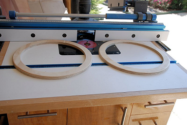 A member on AVS forum kindly made me two 1/2" thick plywood rings that I will glue/screw over the baffle to eliminate the irregular edges and provide a nice mounting surface for the drivers. Plus, they should make the boxes a little more interesting to look at.