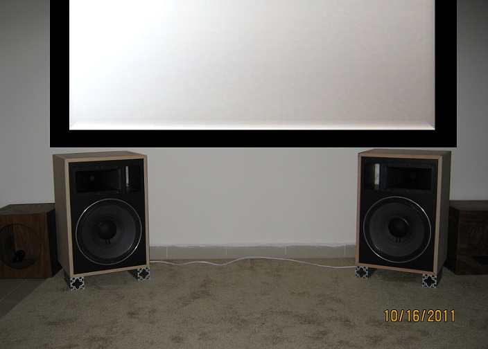 Finally have the speaker's setup and started to break them in by playing a blues CD on repeat all day. Initial impression of the sound is very positive, they are significantly better than the Paradigm 9seMkIII's they are replacing. Here is a picture of them - and the flanking subs - in the room (screen is photoshopped to represent the size of the projected image, I left my screen in the states and am projecting on the blank wall and could not take a good photo showing the image and the speakers).