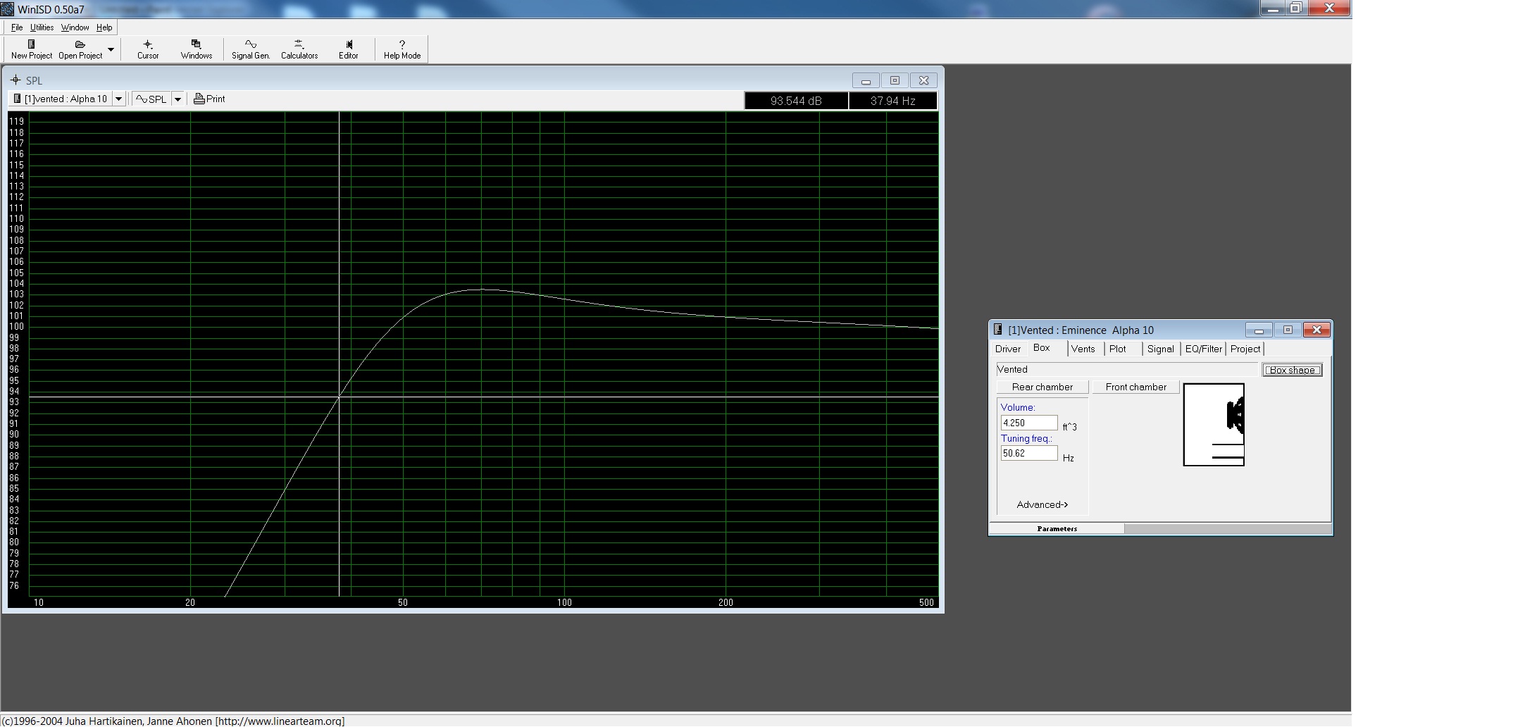 Hy Wayne. Just model Alpha 10 with WinISD and the resulting graph is a very impressive. 29.4Hz @ - 3db in a 10 cf box a very big box for sure. Could tell me how compare your two Pi tower with 4.7cf against the 10cf box? Thanks