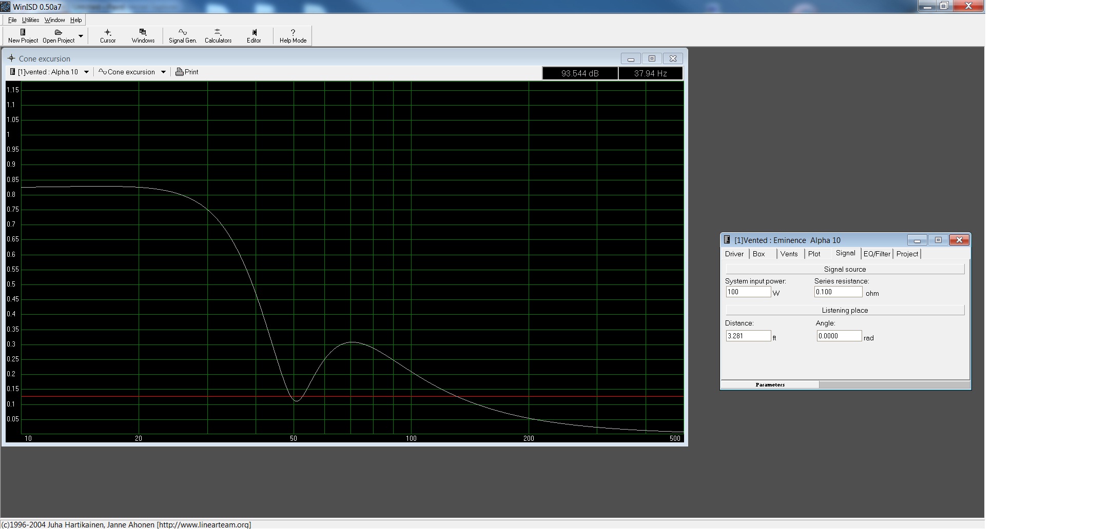 I have played with the default tuning winisd calculates after providing box size/port dia/port length to 40Hz. This change shows 8.86mm cone excursion @ 60Hz (still way over xmax).