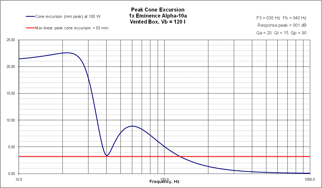 Not doubting, just trying to learn modeling vs. real world. I've checked and rechecked the input numbers and just can't get it straight. Even more confusing is I have modeled several other woofer/subwoofer designs, and all of them were pretty much spot on modeled vs. real world (using xmax as the mechanical limit, I assume to avoid high distortion values).