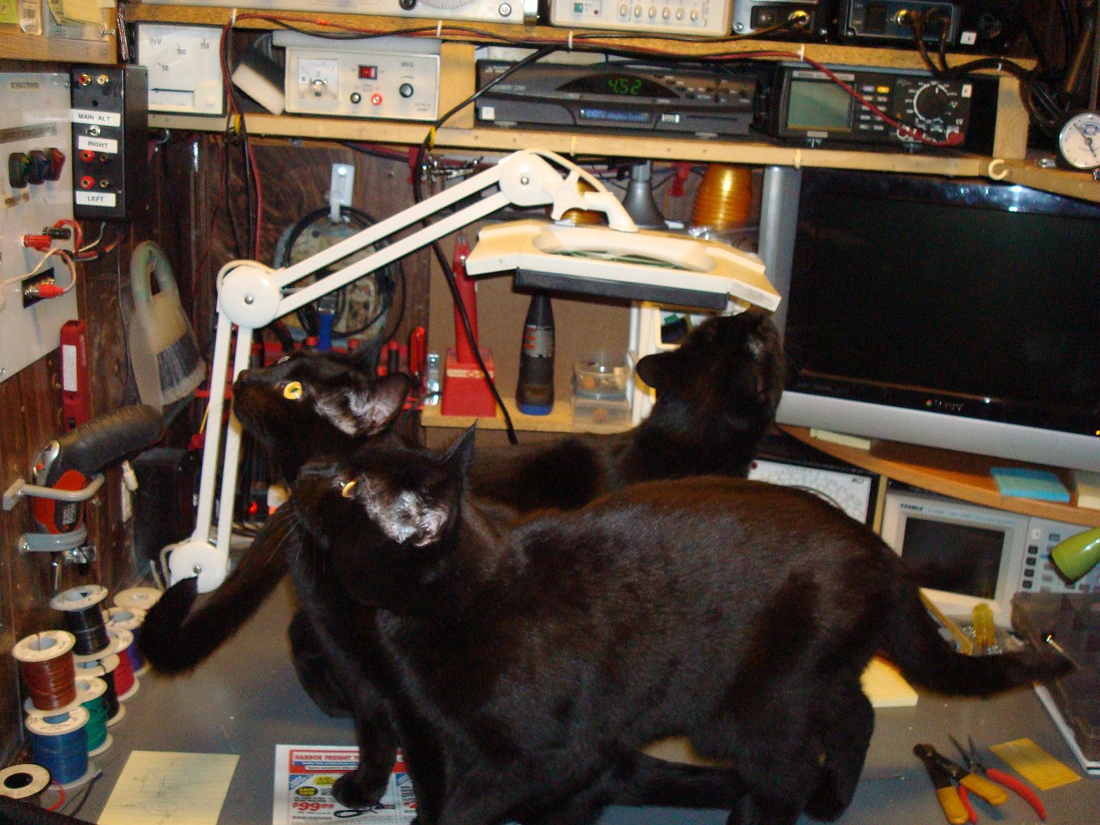 Hi Everyone, In the first photo you will see my able assistants. In the second photo the reason they were so intent on taking over a part of my work bench. The largest of the assistants is nearly 15 pounds, the smallest 12. They are very good at pushing keys on my PC (not in the photo) as well. I haven't been able to teach them to build projects yet, but there is hope as they can find and carry off components with great ease.