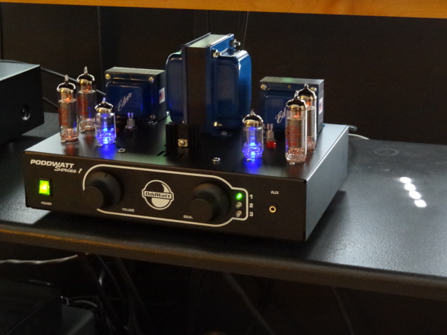 Here's a picture of the PoddWatt amplifier I'll have at the LSAF, recently upgraded with blue LED's under the driver tubes. These blue LED's enhance the visual image of the blue-painted Edcor transformer bells, and they have a huge psychoacoustic effect on the sound quality; Laughing