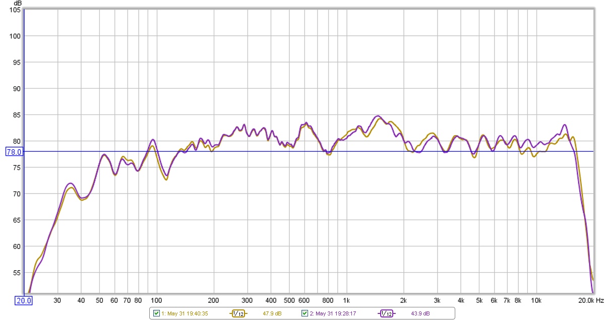 My conclusion is this: Since the mods have not introduced any additional ripple above 200Hz, I'd call it "verified". That's the main thing we're looking for here. We don't want any midrange ripple from internal standing waves. Of course, we can't see what it might be doing below 200Hz, but indoors, that almost doesn't matter.