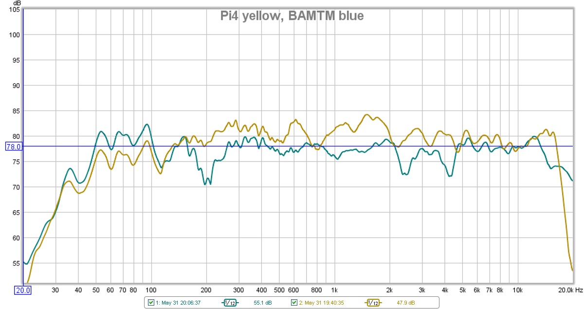 I went ahead and remeasured them based on your instructions (see attached). I took the measurements in my family room and I think that the mic is picking up room reflections. To verify this, I also measured a MTM speaker and one can see how it almost matches the Pi4 response in certain areas (see 2nd attachment, MTM is labeled as BAMTM on the graph).