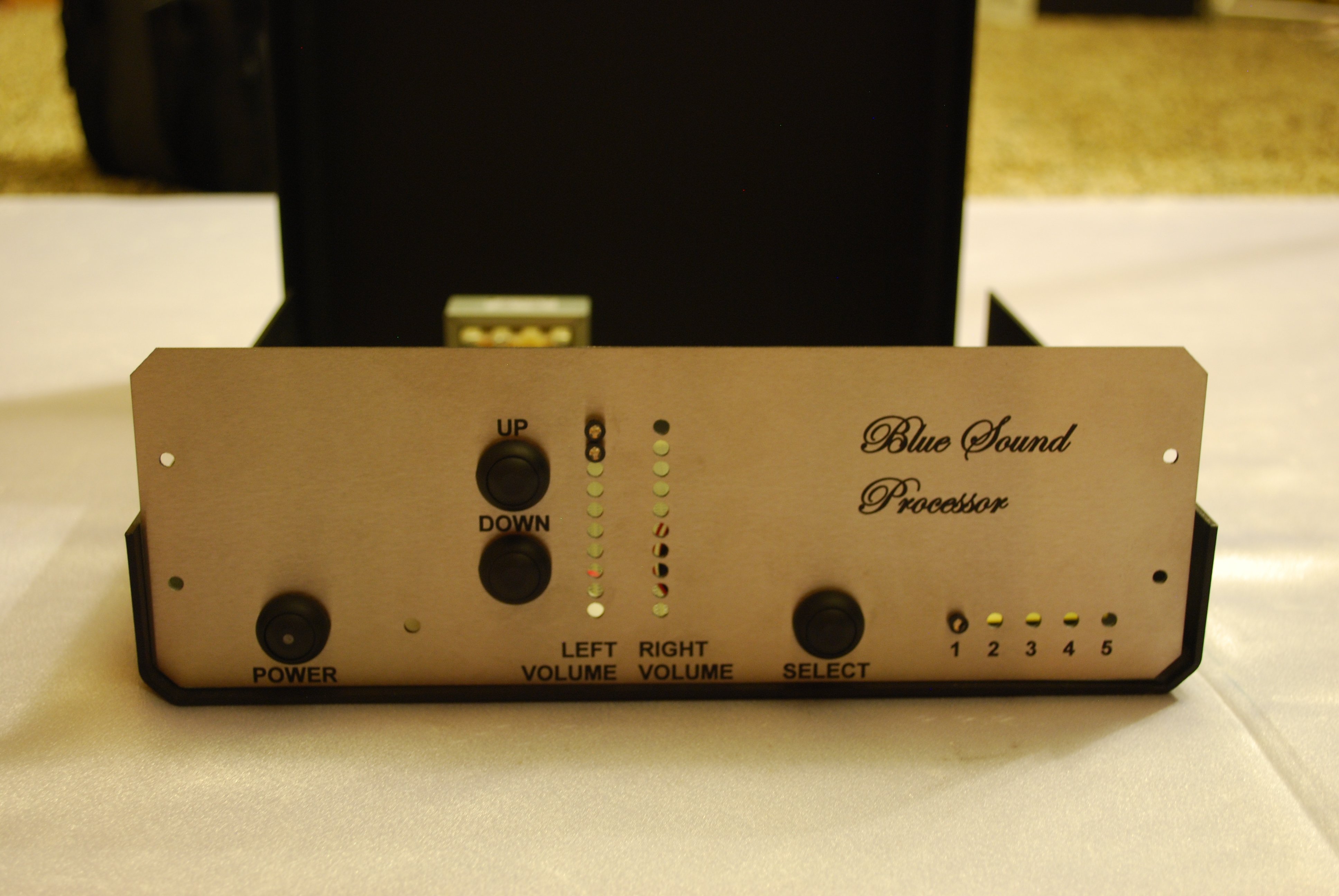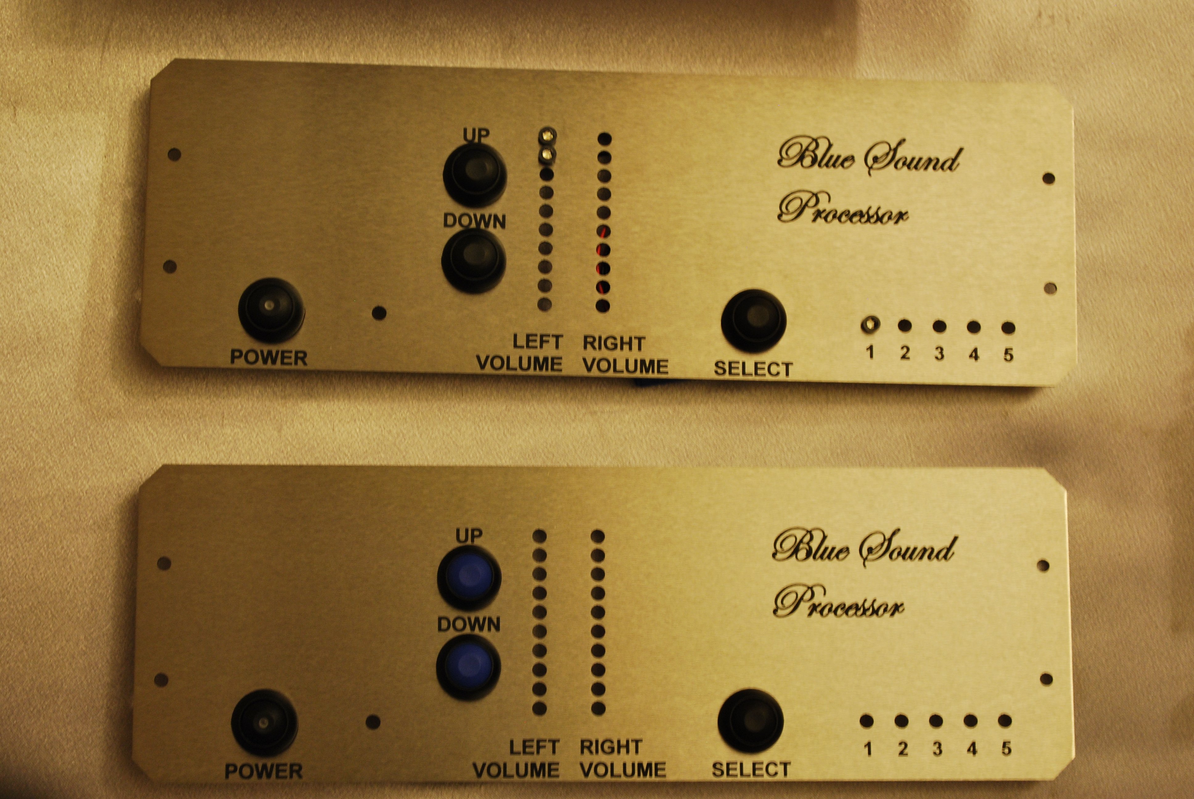 The pushbutton switches are kind of cool, with the power switch having an internal LED that glows when the unit is on. The rest of the switches are just momentary pushbuttons. I debated on whether to have the volume up/down buttons colored to match the processor, i.e. blue for blue and red for red. But I think having all the switches black looks better.