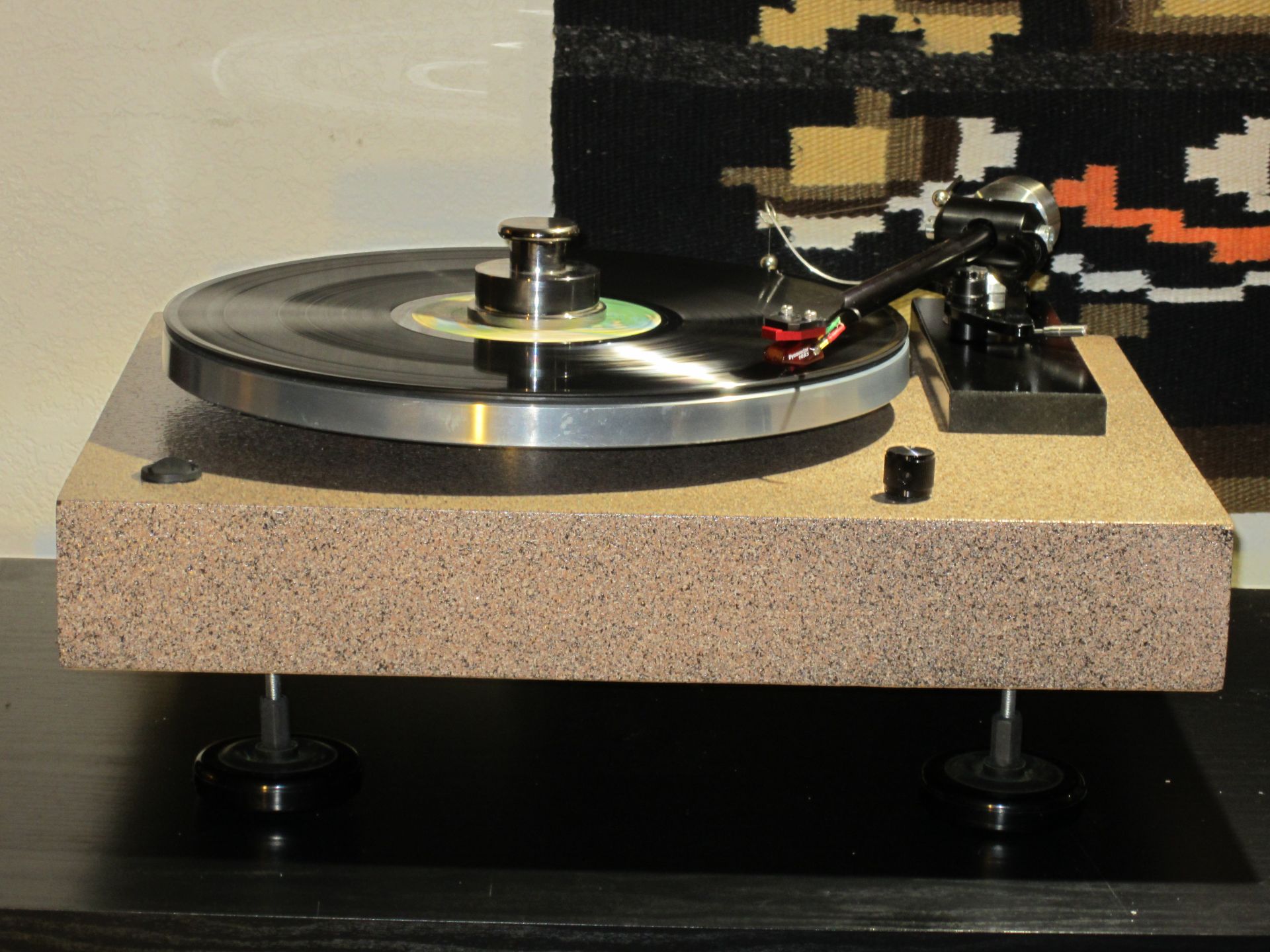 Hi Everyone, It has been a long fight. For a while I thought that the router, saw and paint were going to win...but I beat them into submission. It took two sets of materials, several coats of paint and subsequent removal of it and redo the paint to get what I liked. The Plinth is made of two cross laminated boards that were themselves laminated 4 inch wide strips. So it is rigid and should be resistant to warping. The arm board is of high density particle board. Motive power is by a Dual 701 direct drive assembly. The arm is an Origin Live Alliance ( a knife edge variant of some of their other arms). The cartridge is a Dynavector 10X5 with a Soundsmith ruby cantilever. The paint is BTW "sand paint" and is textured. I covered it with two clear coats of acrylic. The feet were salvaged from a junk TT. It works great and with a weight of nearly 30 pounds is immune to nearly any sort of vibration.