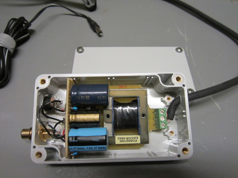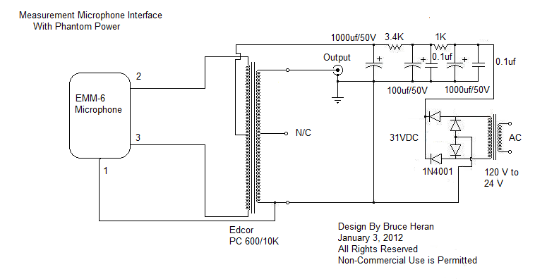 Hi Everyone, I recently got a calibrated microphone for doing audio measurements. Unfortunately, I had no way to connect it to anything. So after doing a bit of a search on what it really needed to work I built a small interface for it. The microphone requires a phantom power source between 15 and 48 volts and has a 200 ohm balanced output. I used a standard wall wart that gave out 32 VDC no load. It was rated for 24 VDC, but the drain is so small that it was able to deliver the full 32 volts. The schematic shows how an AC wall wart and rectifier could be used. The number of sections in the filter is probably excessive, but I like to be sure the DC is clean. Yes I know that a phantom powered microphone should be able to reject PS crud, but I want to be sure what I measure is not contaminated by PS junk. The matching transformer is from Edcor and is under $7. It has excellent specs (20-20KHZ) and is well suited for this application. The box is an ABS type and also inexpensive. Build is not complicated or critical as the impedances are low. It might be sensitive to nearby EMI sources so a metal box might actually be better. I can feed the output into either my laptop running TrueRTA software or into the Velleman PC based DSO on my main PC. Results agree with previous ones made on cruder gear.