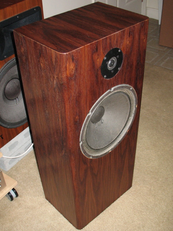 Bob Brines has a nice tutorial on his site and I copied his use of Titebond II. I gave my self an escape hatch: I need grills for these speakers because they're going in a house with curious little hands, my Granddaughters. My design has a double baffle about 2/3 (Golden Mean, actually) of the way up and then the grill the remainder.