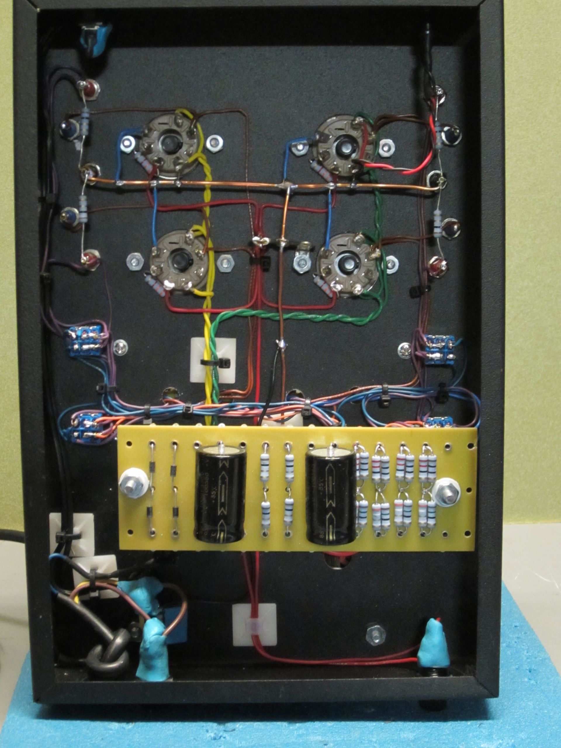 Hi Everyone, Another project based on need. If you use lots of tubes (like I do) you are sure to find that matched ones are not all that well matched by all suppliers and often even matched ones don't stay that way. Hence the need for some way to "cook" the tubes for a while and then match them. The device I made will do 1-4 tubes at a time. The only restriction is that they must have the same pin arrangement as the 6L6/KT88 and so on. Many power tubes use this arrangement. The circuit uses cathode current sources to select the current for the "burn". Values of 60, 90 and 130 ma are selectable. The B+ is 355 and typical cathode voltages range from 25 to 40 volts depending on tube type. This allows for burning most common tubes in the 60-80% of their dissipation range. The tubes are run in pentode mode. I set it up to measure the cathode voltage and current flow for each tube. To match tubes, all you need do is get ones that have similar cathode voltages at the same current. This is because the grids are at ground potential and the CCS automatically adjusts the cathode voltage for the programmed current. The difference between the two voltages is the bias that would be required for that current flow. This process is particularly good for selecting the tubes for the class A push-pull amps I favor. Measuring the cathode voltage will also indicate ones that drift and are generally unsuitable for quality applications. The down side of the tester is that it uses a lot of power. When running the max load (130ma) on a quad of KT120s power consumption is nearly 300 watts and will nicely warm a cold room. BTW the power transformer can deliver nearly 1800 ma at full voltage. It is an previously available Edcor type that I used in a long past project. index.php?t=getfile&id=1052&private=0