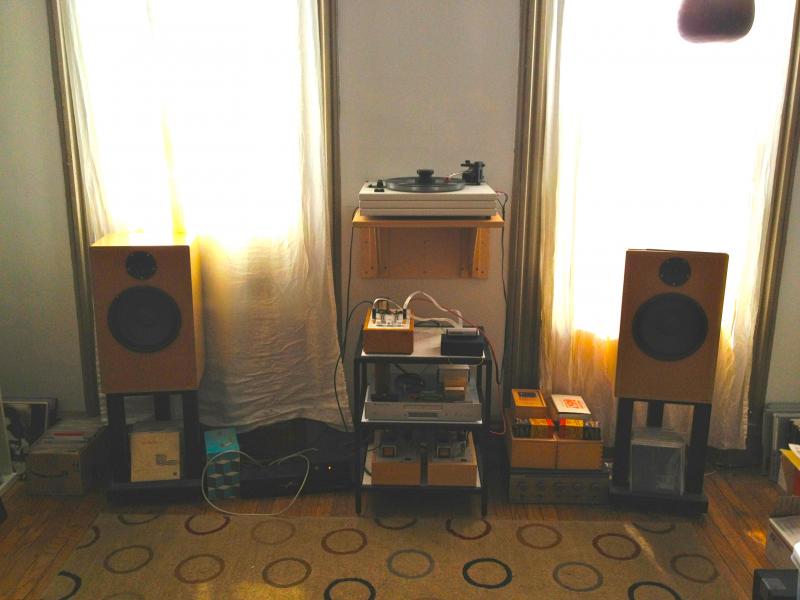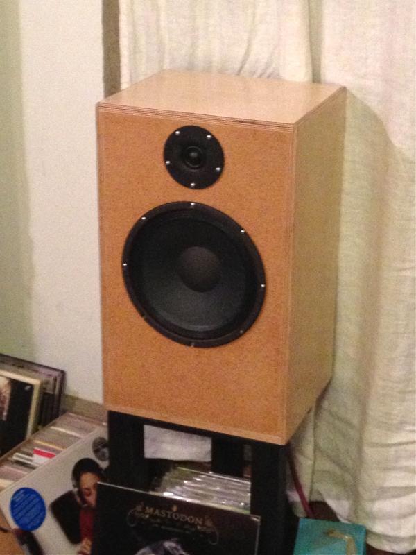 Cork-lined front baffle, Finland birch plywood, rear panel is particleboard. Finished with about a bazillion coats of tung oil and paste-wax-buffed to a shine.