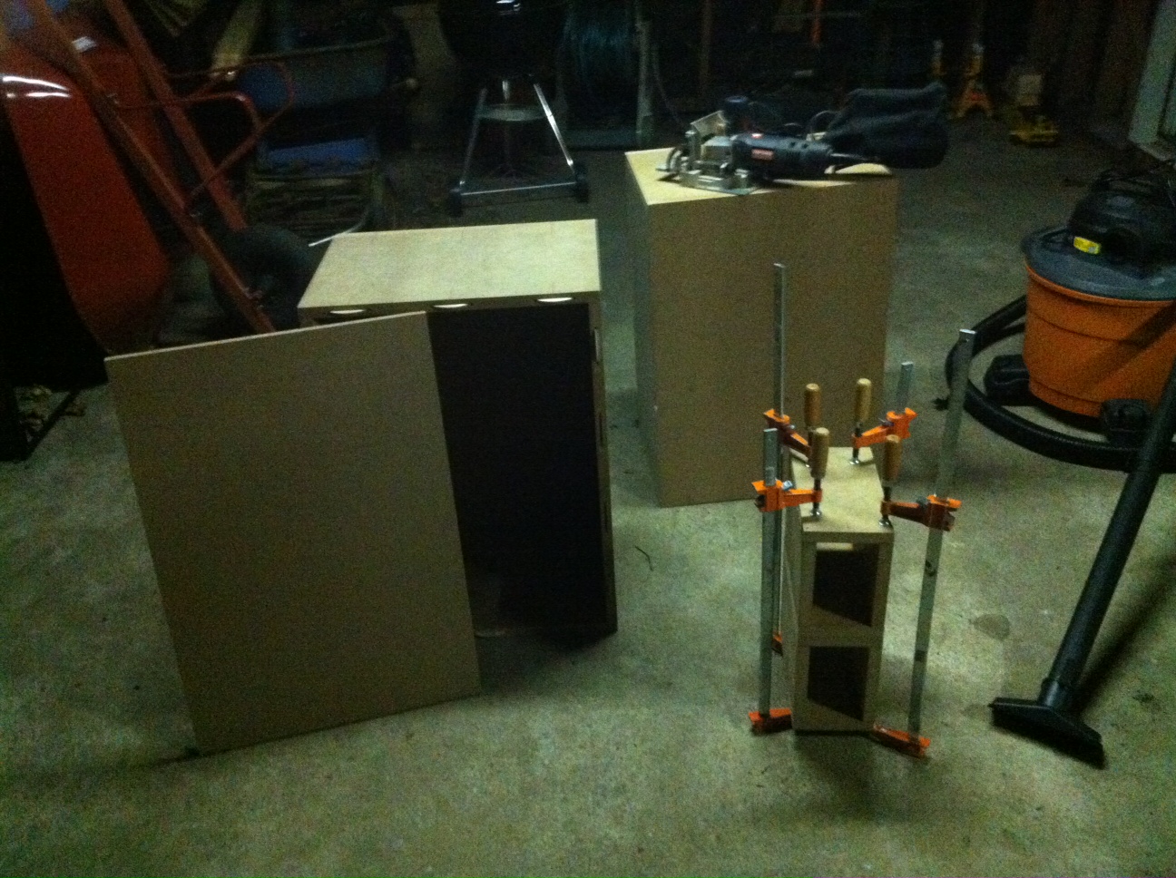 Building the cabinets: I built the cabinets with fully biscuited 3/4" mdf panels. The biscuits ensure panel alignment when gluing up and add strength to the final cabinet. Someone gave me a cheapo 10" ryobi table saw a while ago- don't even bother with anything like this. While it is fine for ripping things down for some house projects, it is not a precision tool, even with the crosscut jig I built for it. On top of that, it is light and has to be supported from falling over when mounted to it's legs. I ended up using my buddy's saw with a 4' wide plinth, good runoff table, and a long fence that actually squares. All of the panels were accurately cut within 45 minutes. Use lots of clamps and excessive glue - the glue that squeezes out is easily scraped and sanded down when dry. It also ensures a sealed cabinet when building flush panels. After getting rid of the assembly glue, I squeezed a bead on the inside seams of both cabinets to make sure it's doubly sealed. Use a vacuum attachment to the biscuit joiner and the router - usually a cheap adapter piece for any shop vac will do. This helps keep the tool's cutting area clear, your shop area clean, and your lungs and eyes happy. 80 some biscuits = 160 cuts = lots of nasty mdf dust.