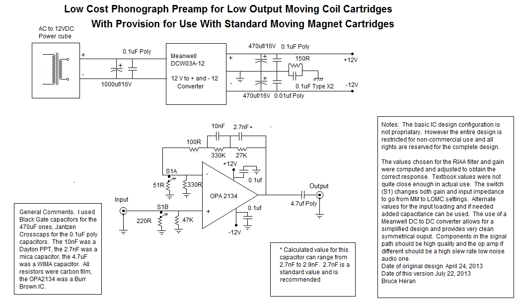 Hi Everyone, I didn't want everyone to think I only do tubes (about 95% true though) so I did an IC project. I wanted to see how quiet I could get a preamp for low output moving coil cartridges (LOMC). So with a bit of studying and a bit of bench tweaking I came up with one. Response is as flat as I can measure between 10HZ and 30K IAW the RIAA curve. S/N above 100HZ is -96 dbv. At 20 HZ (worst case) it is -89 dbv. Very very quiet. The gain is about 58-59 db and input impedance is 200 ohms. The gain and input impedance can be adjusted rather easily. The sound is quite nice and the preamp could easily be the only one someone might want.