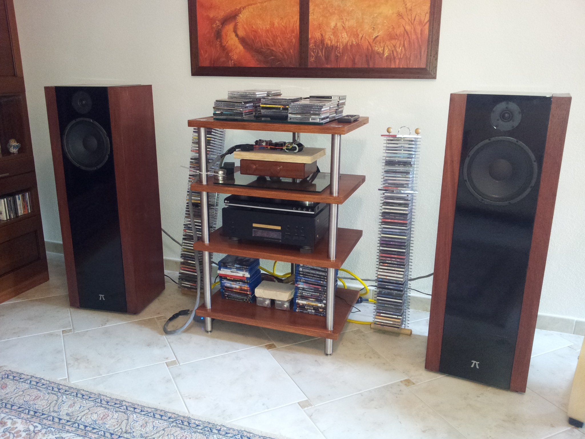 They are positioned in a living room of about 30 square meters, close to the rear wall, about 20 cm of air, and slightly angled toward the listener who sits about 3.5-4 meters from them. The distance between the two towers is about 2 meters, but when listening carefully I increase the distance up to about 2.5 meters.