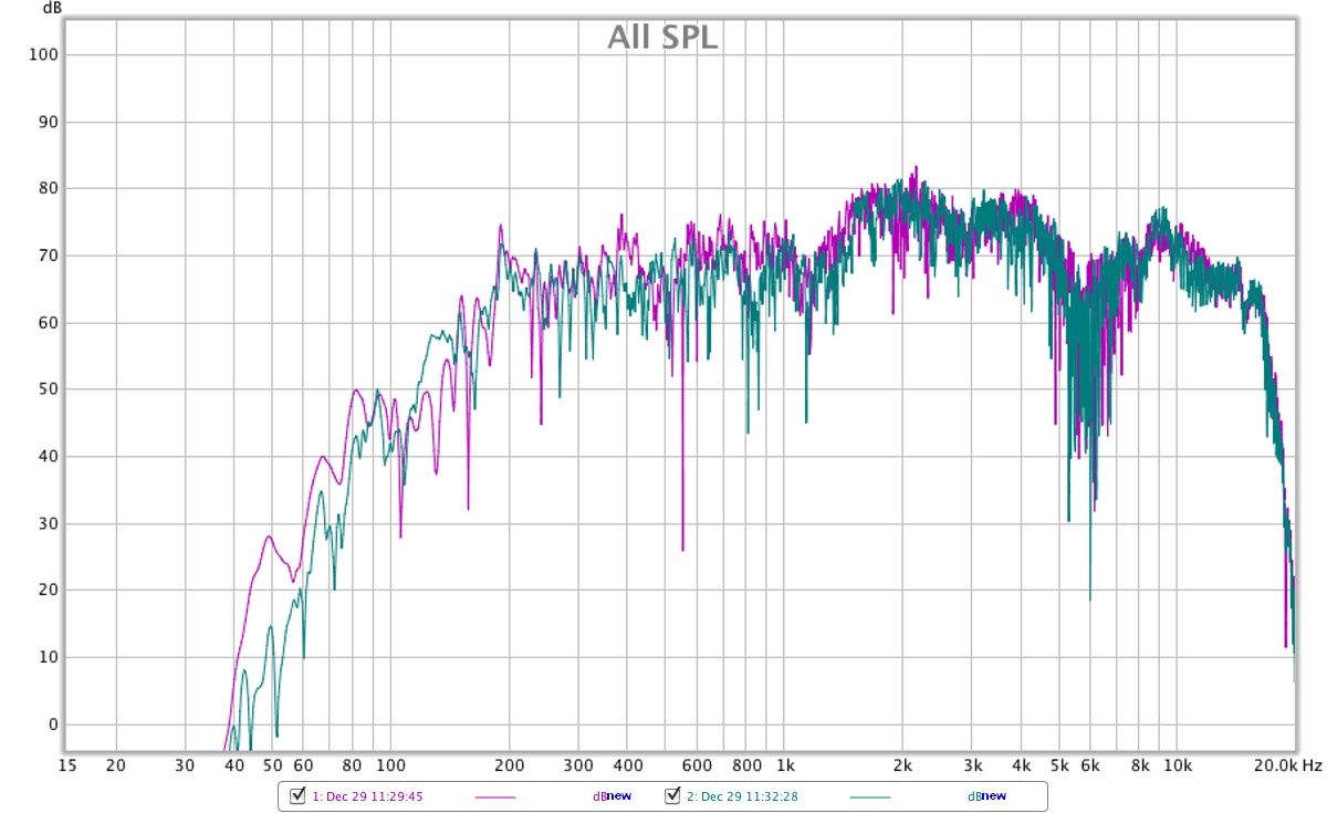 OK - finally ran an spl sweep. This was taken with REW 5.0, using the internal mic on my mac. Magenta is the left channel, teal is the right channel. Like Lucasmateo's test, there is less spl below the crossover point. There are other anomalies too, but perhaps some of this is from the low quality test equipment and procedure. What is good is that both channels measure similarly! Matthew