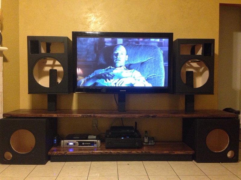 Note: it looks like the posts under the mains go through the bottom of the cabinets, but they don't. I just happen to have my HTIB speakers sitting inside the cabinets temporarily and they are the same size and color as the posts.