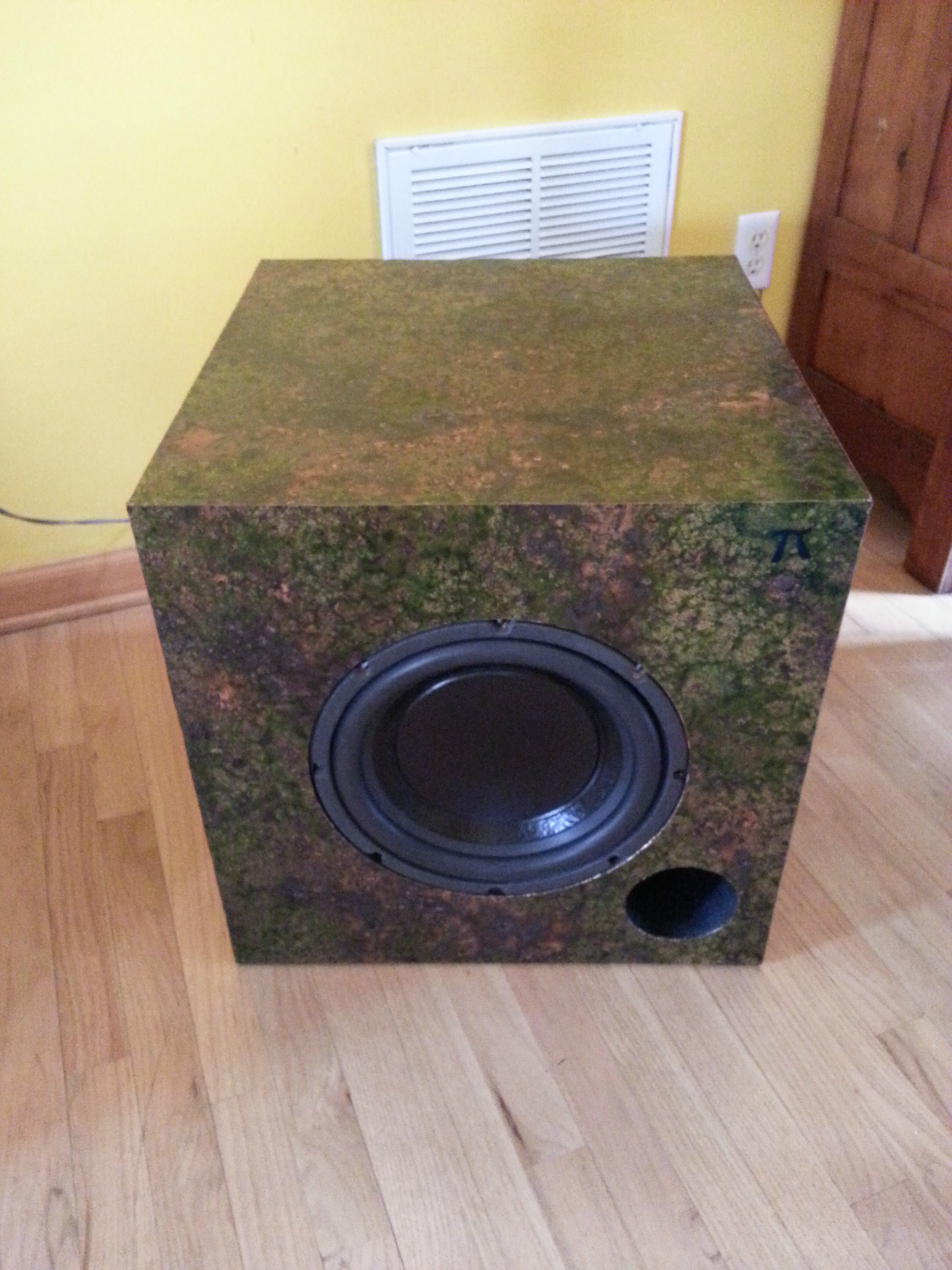 I used copper laminate on the subs, and they came out pretty well. We've had quite a few cloudy days lately and the speaker didn't show up well in my photo, so I included a photo of the top of one of the speakers so you can see how beautiful they came out.