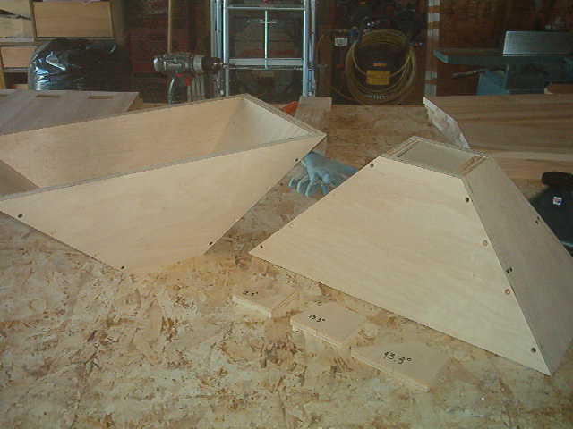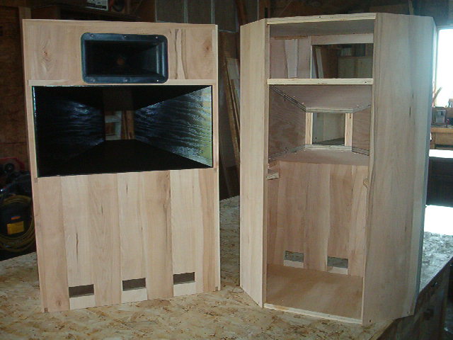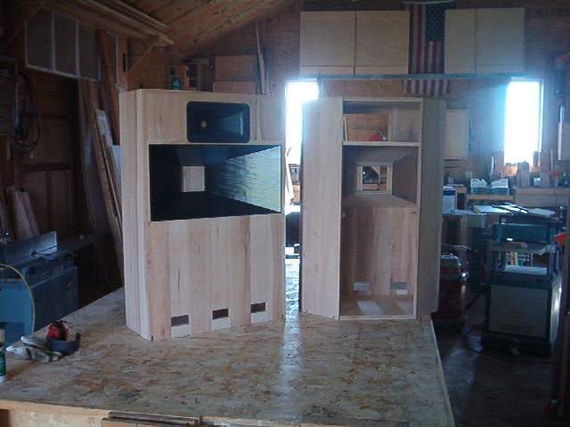 The cabinets and horns are simple, but they're not, if you know what I mean. More, higher-rez pictures will follow once we do final asembly and have them lacquered and ready to play. Wayne, we're contemplating using rock-wool insulation batt pieces instead of fiberglass- any thoughts? We can easily change it if we don't like it, but with rock-wool becoming available in north america in home centers, I prefer it to fiberglass for any job, even for damping in speakers. Thanks, Wayne, thanks, guys.