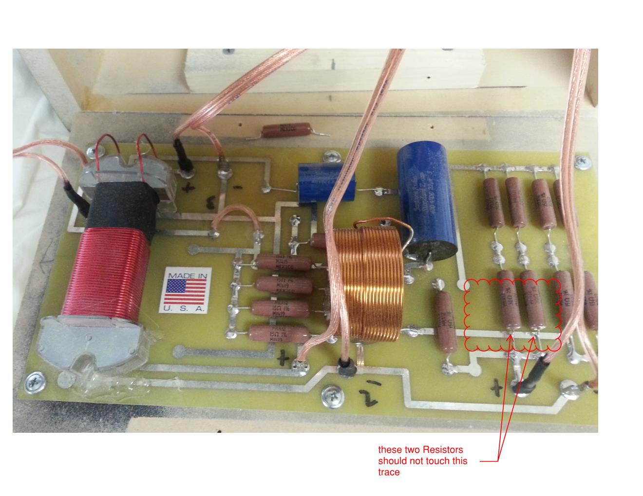 I can see that resistor R5a is missing, so I'd suggest putting that back. And I agree with Matt, I would check to make sure the leads from R1b and R1d are not bent, touching the trace from L1.