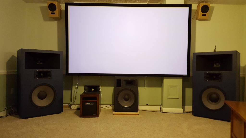 Decided the 4 Pi in the center was out of place, but due to not having an acoustically transparent screen had to come with a different plan (one that used the JBL 2226H's from the previous 4 Pi speakers).