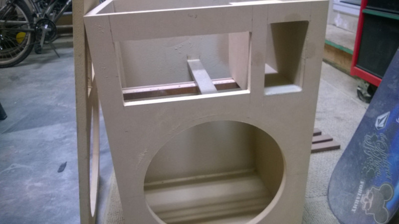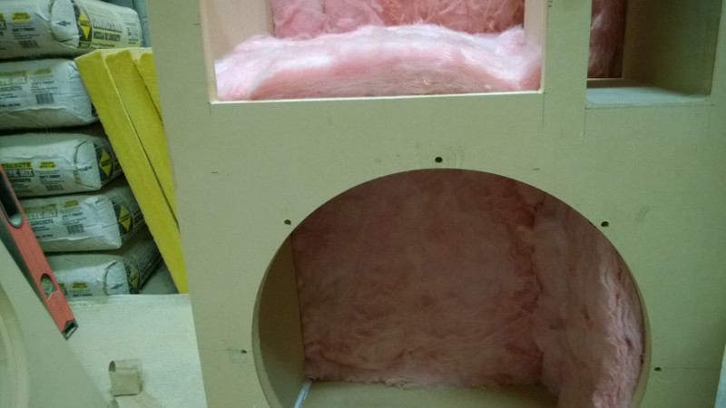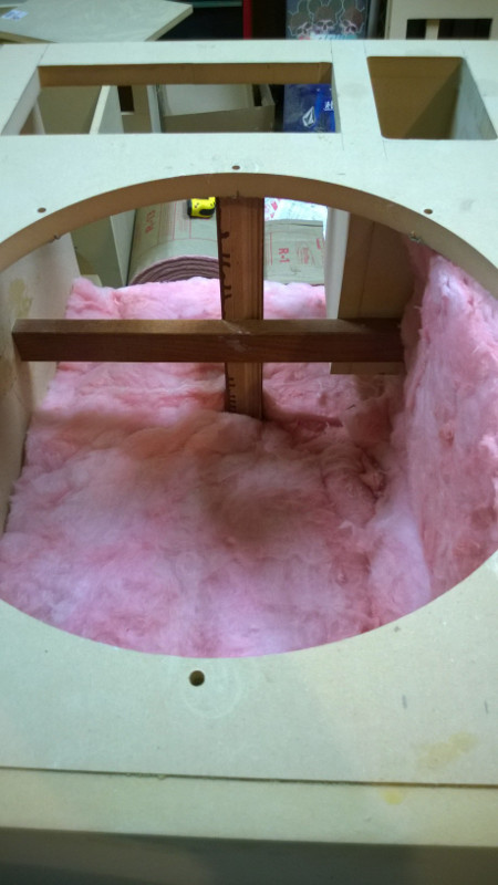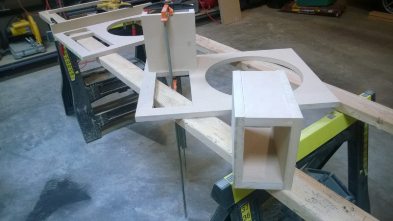 When cutting holes, the only hiccup I ran across was the hole for the JBL. The plans called for a 13 15/16" hole, but that wasn't large enough for my speakers. I ended up going with a 14 1/16" hole. I didn't try a 14" hole, so I may have sacrificed more wood than needed, but the speaker fits now. Maybe the larger size is related to the original 4 ohm speakers I got. Who knows.