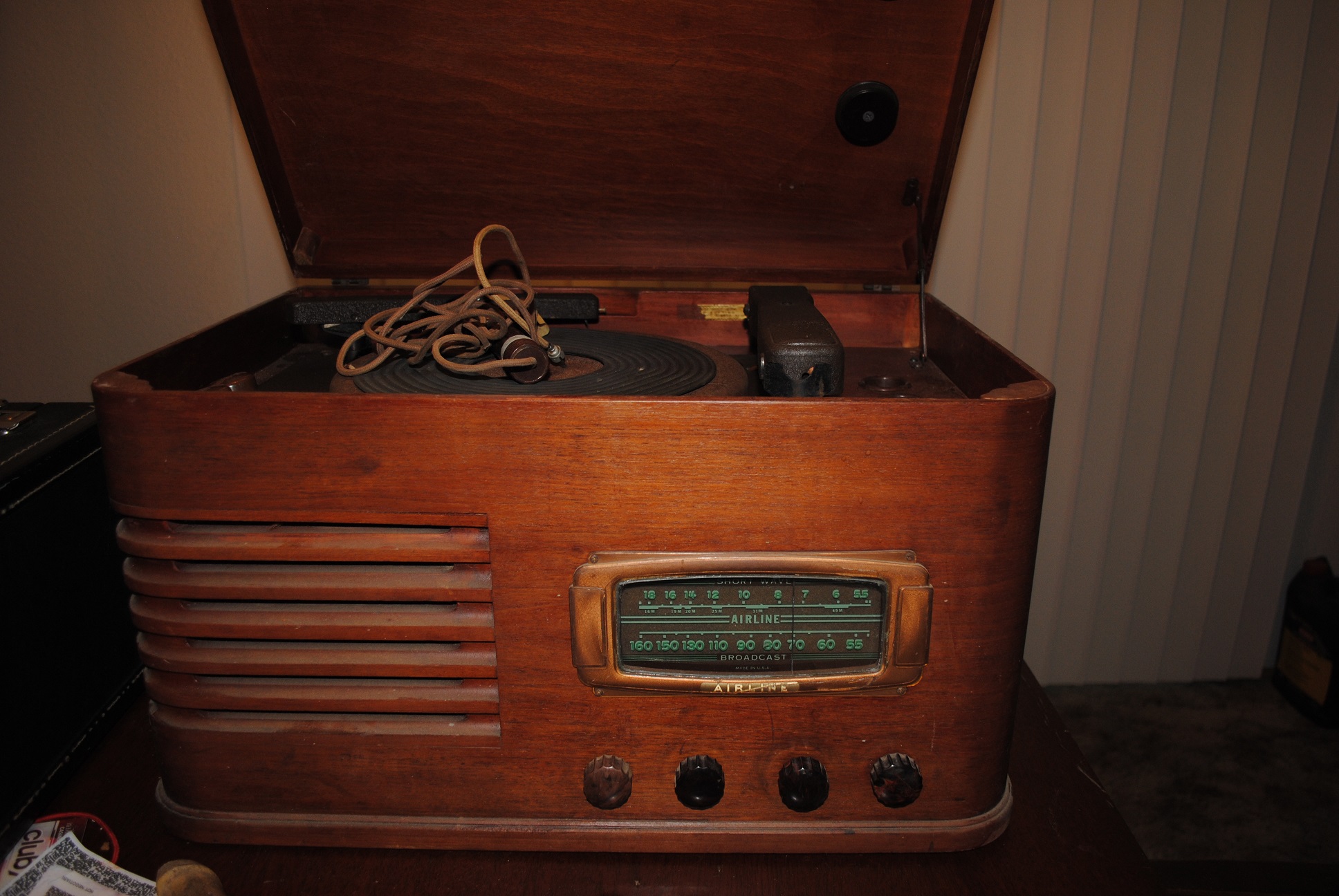 I need to identify an Airline radio that has phono play and record as well as short wave with broadcast and record mic. There is no identification sticker inside. I can fwd pics if some one can help. It is in working condition and the wood case has been restored.