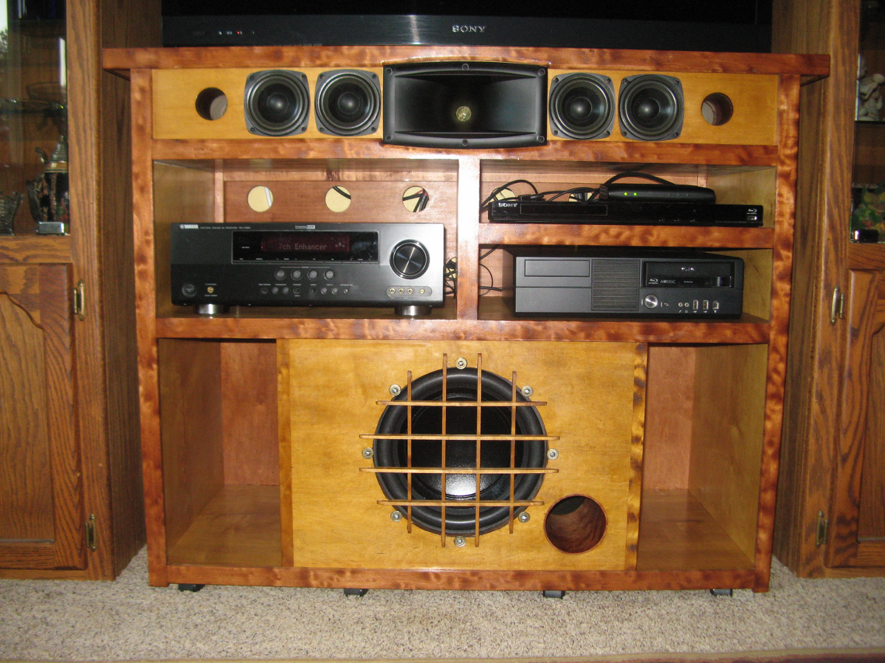 After a really long time, I figured out what I wanted and built my sub into a TV/stereo stand with integrated center channel.