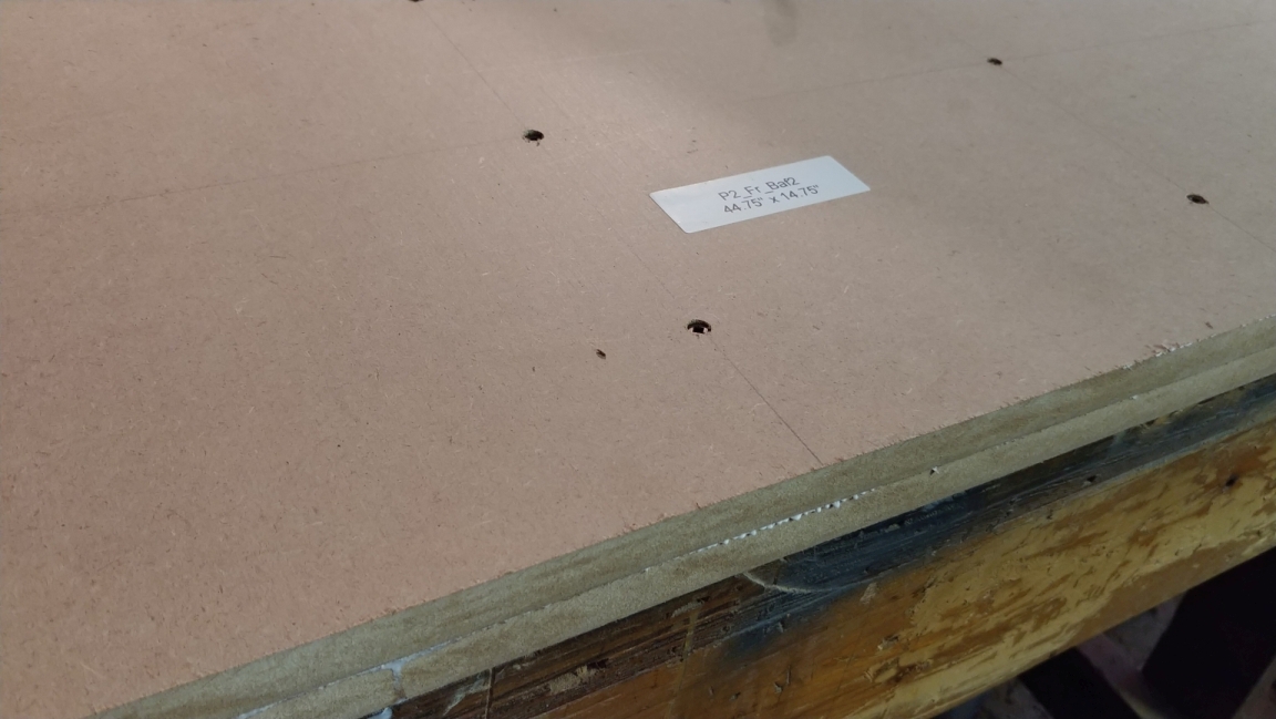 I stacked all my sheets on a pair of saw horses, then used pieces of scrap up elevate the top sheet for rough cutting. Label your parts! If you are like me, the rough cut parts at the end of the panel get left over-sized and easily get mistaken for a different part. Use stick on labels, blank labels and a sharpie are fine if you don't want to print them. I print my labels before I cut, and I know I am done when I run out of labels. I suggest not using pencil (it easily rubs off MDF), and never use a marker directly on the MDF (it bleeds through).