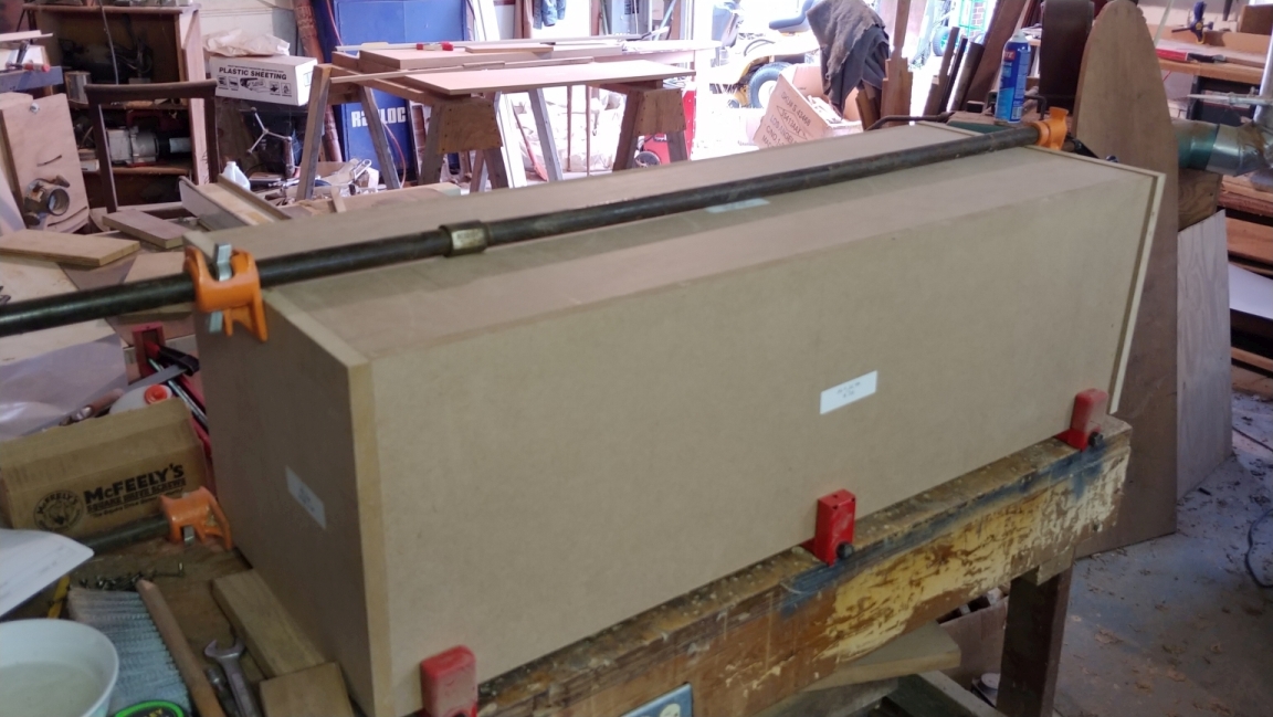 My work flow for this was pick up the MDF on the way home from work, rough cut all the panels, and glue the laminations so they could cure overnight. The next day, I ripped the panels to width, and trimmed to final length. The top and bottom panels where ripped to the same width as the sides, but only 1 edge was cut square at this point.