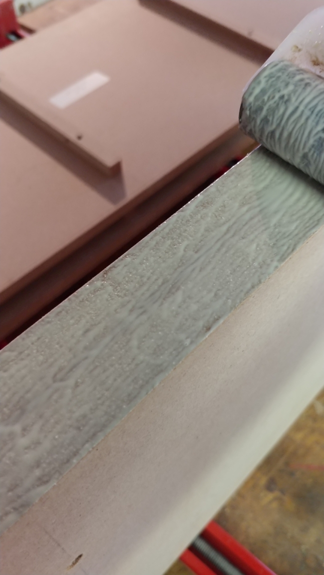 Second, use the right amount of glue. The glue needs to be spread evenly into the material, and it should be thick enough to be almost opaque. I used a large notched trowel like the type used for mortaring up tiles. The glue is spread evenly on both surfaces with the smooth edge of the trowel forcing it into the MDF, then the notched edge is swept over the glue. The last step is important, if the glue is not notched, the glue will not flow out properly.