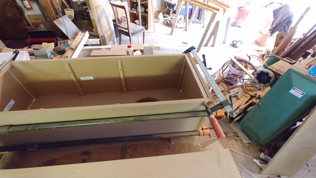 I then slightly loosened the bar clamps holding the sides against the back and slightly tightened the pipe clamps so the carcass could relax or twist as needed for the top and bottom to go on square.