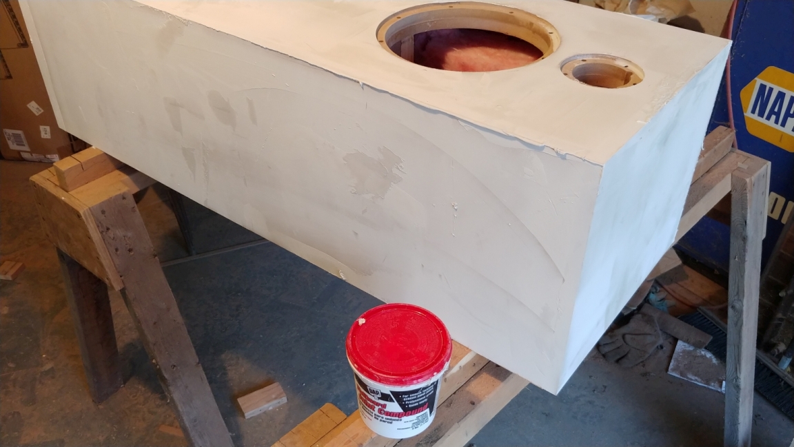 After sanding, I wiped the speaker down with a very lightly dampened clothe and covered the entire thing with filler. I use garden variety all-purpose joint compound meant for drywall. The stuff I use is gypsum in a vinyl binder.