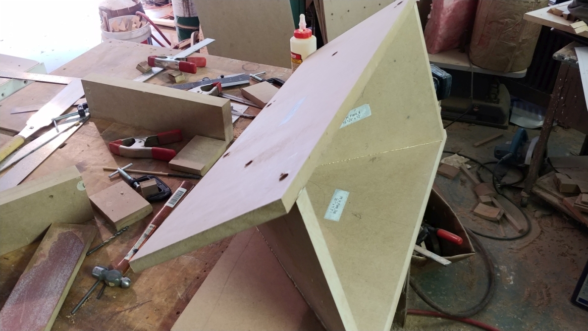 Many of you probably noticed the flare sides where rough cut as rectangles rather than as trapezoids. At first glance this might appear to be grossly wasteful of materials. It is, but the offcuts will be used later as bracing, mitigating some of the waste. The main reason they are cut as rectangles is so that the mouth and the throat are parallel to each other. This would be very difficult to accomplish otherwise. This ties back to my earlier post about constantly asking myself "how am I going to cut that, and how am I going to install that." Planning the cutting and assembly during the design stage is a huge benefit.