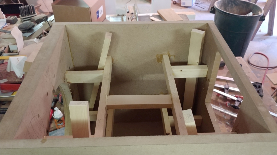 I then cut 1x2 pieces to size as braces. All of these are spring fit, and require no clamping. To get the short piece that spans the middle in, I used clamps to flex the longer cross braces back so I could fit the shorter brace in without scrapping off all the glue.