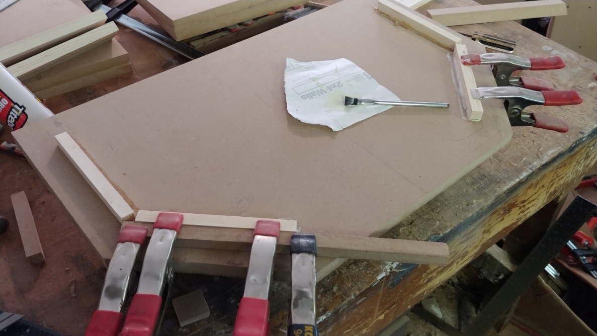 I began the assembly by gluing the miter. I tightened the screws just enough to begin cloing the joint, but not enough to make it rigid.