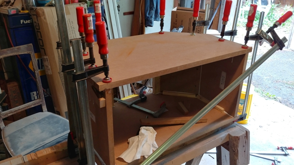 Clamping order is important here. I flushed all the front edges and lightly clamped vertically just at the front. I then clamped the cross wise to pull the side panels up against the braces. Next, I tightened the screws at the miter to draw that shut, and added a vertical clamp over the miter. I only have one clamp large enough to draw the rear side up to the braces that is still light enough to not be unwieldy. So I used this clamp with a piece of scrap to pull the rear sides up to the braces, followed by a vertical clamp to hold it in place. The horizontal clamp is then removed since it will draw the box out of square. Lastly, I measured corner to corner and clamped diagonally to square up the mouth of the box. The mouth needs to be as square as possible. Mine only required a little bit of coercion to square it up.