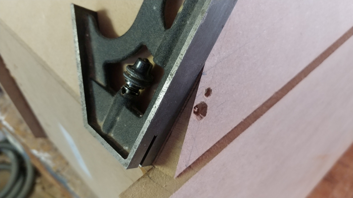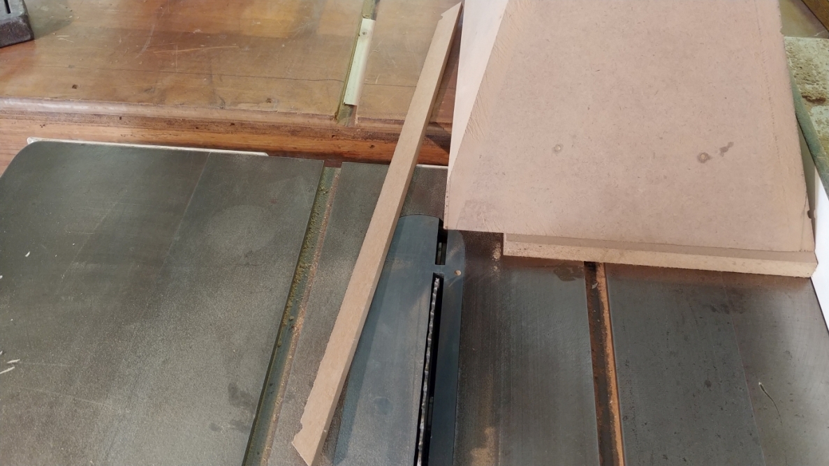 Note the large piece of MDF clamped on the left side of the blade. This is to prevent the offcut from falling onto the angled blade and getting kicked back.