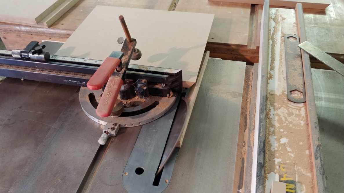 Note the large piece of MDF clamped on the left side of the blade. This is to prevent the offcut from falling onto the angled blade and getting kicked back.