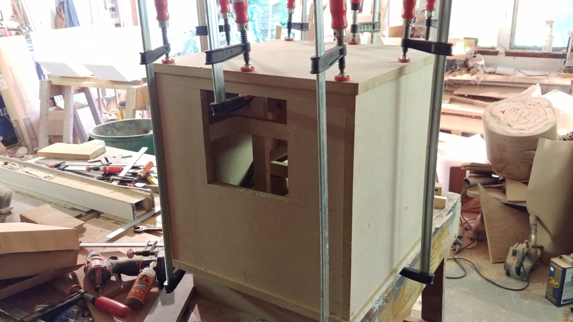 Clamping order is important here. I flushed all the front edges and lightly clamped vertically just at the front. I then clamped the cross wise to pull the side panels up against the braces. Next, I tightened the screws at the miter to draw that shut, and added a vertical clamp over the miter. I only have one clamp large enough to draw the rear side up to the braces that is still light enough to not be unwieldy. So I used this clamp with a piece of scrap to pull the rear sides up to the braces, followed by a vertical clamp to hold it in place. The horizontal clamp is then removed since it will draw the box out of square. Lastly, I measured corner to corner and clamped diagonally to square up the mouth of the box. The mouth needs to be as square as possible. Mine only required a little bit of coercion to square it up.