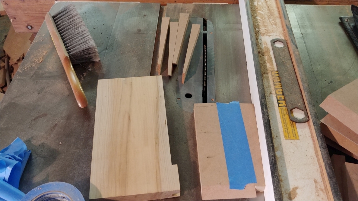 I began by ripping the backs for the midhorn and crossover box to fit their individual horns. I then taped the back cover and crossover back together, and cross cut them to fit the midhorn. I used layers of tape on the miter gauge to adjust the angle as I cut them. This is much simpler than adjusting the miter gauge, and just as accurate in this case.