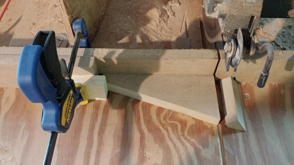 Done wrong, this can be a very dangerous operation. Note the wide part of the guide is closer to the blade. If the tape fails and the part being cut slips, the taper will cause it to move away from the blade. If the taper is run the opposite way, the part will wedge between the blade and fence causing a kick back.