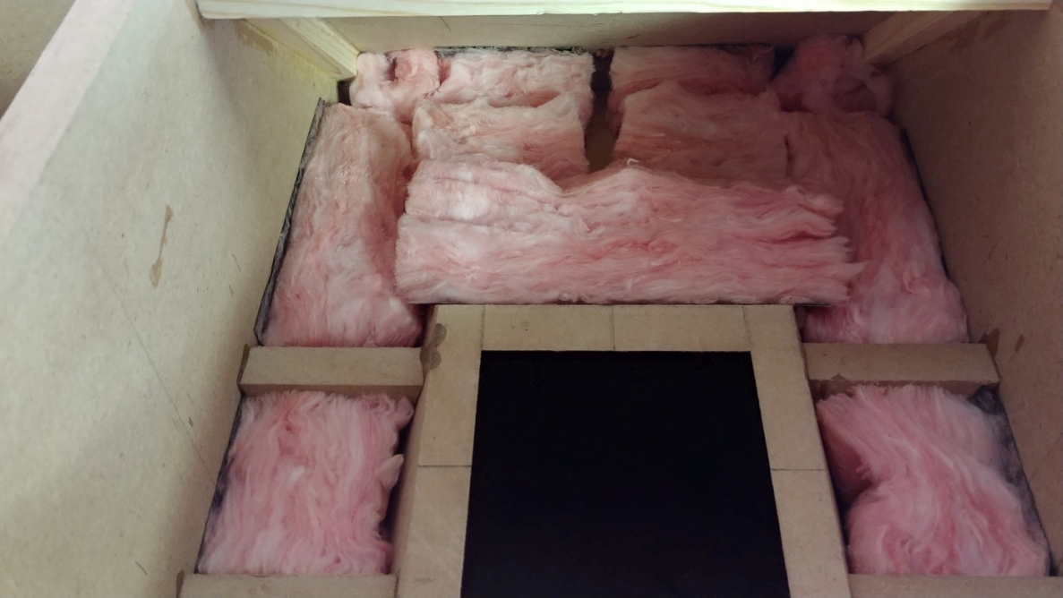 After gluing in the driver mount, I glued 3/4" (19mm) square pine strips to the top and bottom of the box at the back. These strips will hold the inserts for the back cover. I also glued in some 3/4" (19mm) braces along the driver mount to top/bottom joint. I then taped some brown construction paper inside the assembly to prevent sawdust from getting down into the stuffing.