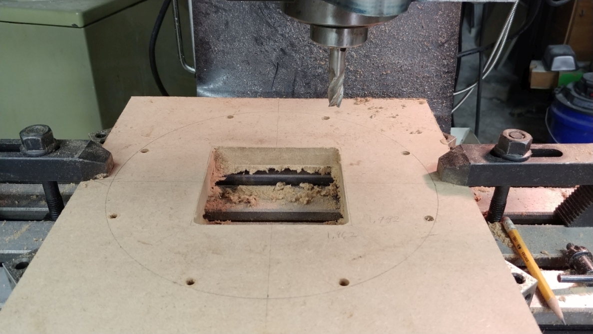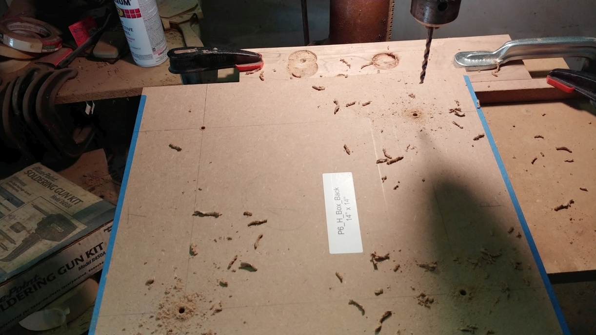 I have a rolling cart that I use for my drum sander that turned out to be just the right height to put under my drill press for drilling the mounting holes for the back cover. This was easier than attaching an oversized table to the drill press. I also have a bench top drill press that would have worked nicely by turning the head around.